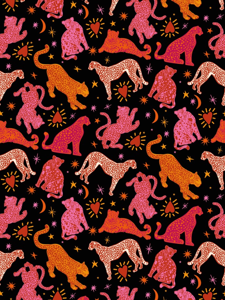 Atrevete a descansar con poder y estilo con Fantasía Felina Negra, un estampado audaz lleno de colores vibrantes, corazones, estrellas y leopardos en movimiento sobre un fondo negro intenso. Es una explosión de energía y personalidad para mujeres que no temen destacar incluso en sus momentos de relax.