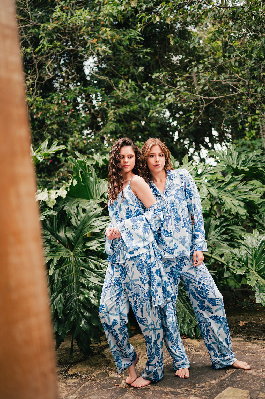 Elegí descansar con la serenidad del azul. Amazonas Celeste combina un diseño lleno de hojas y flores en tonos fríos que transmiten equilibrio, frescura y un toque de sofisticación natural. Es la pijama perfecta para quienes encuentran belleza en lo simple y gusto por los detalles.